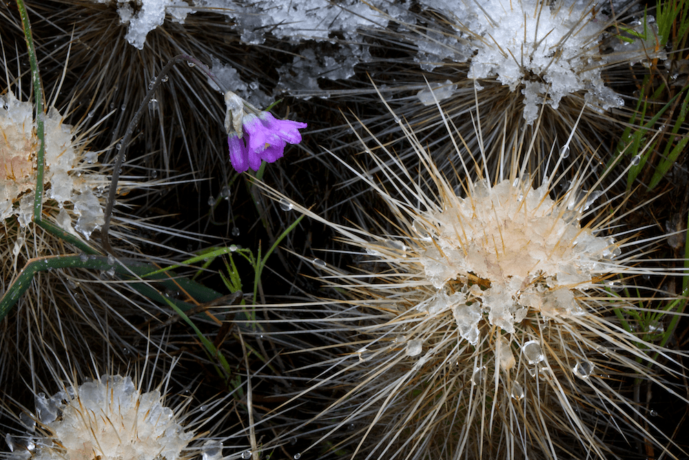 Above are two examples of species shown in the melting snow – the flower is Dichelostemma capitatum (Asparagaceae) and the larger plant is an Echinocereus (Cactaceae). Their common names are bluedicks and hedgehog cactus, respectively. A rare view of the desert in winter.