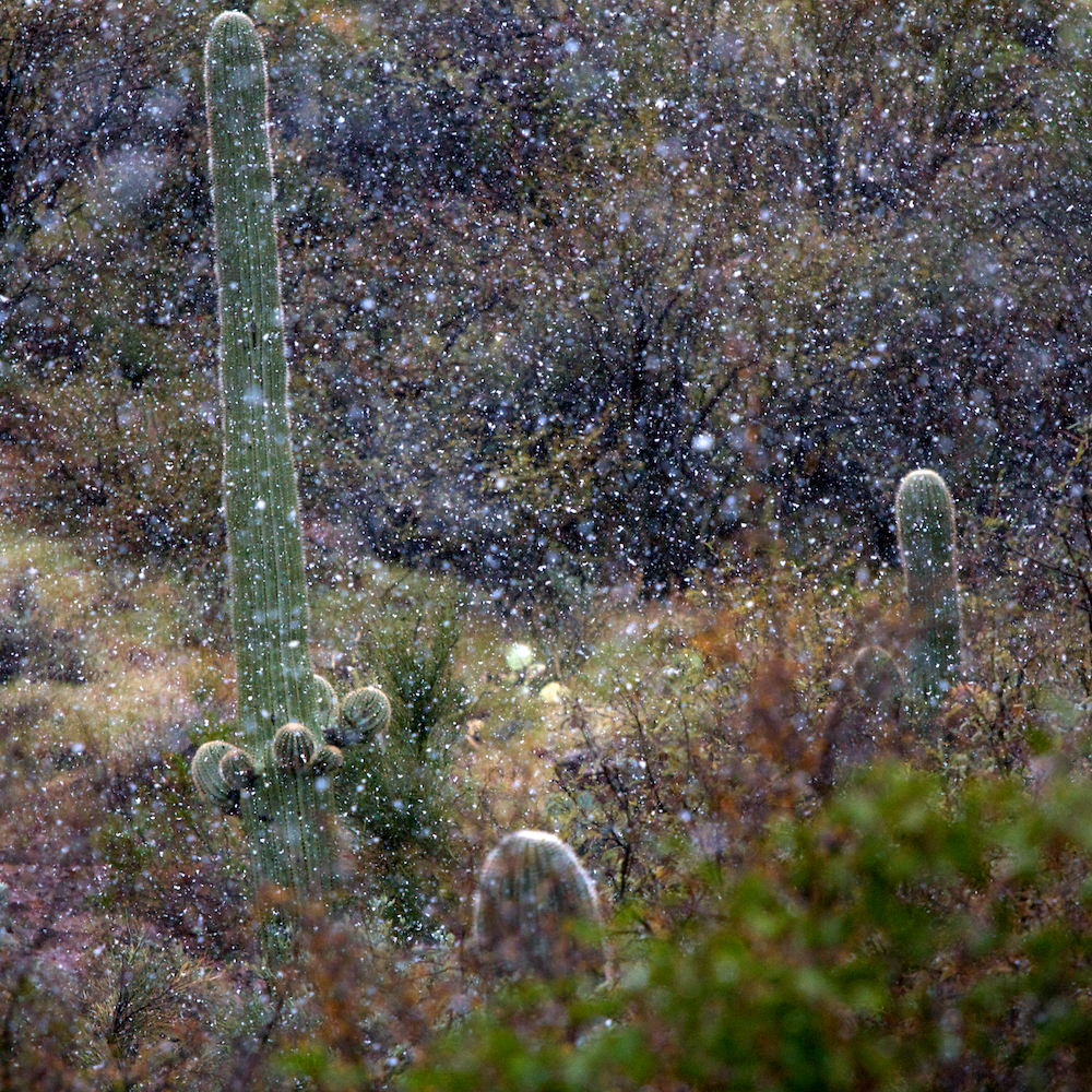A heavy snow fell this weekend, blanketing cactus and jojoba alike. The day before this storm I was hiking in 85°F sunny weather!
