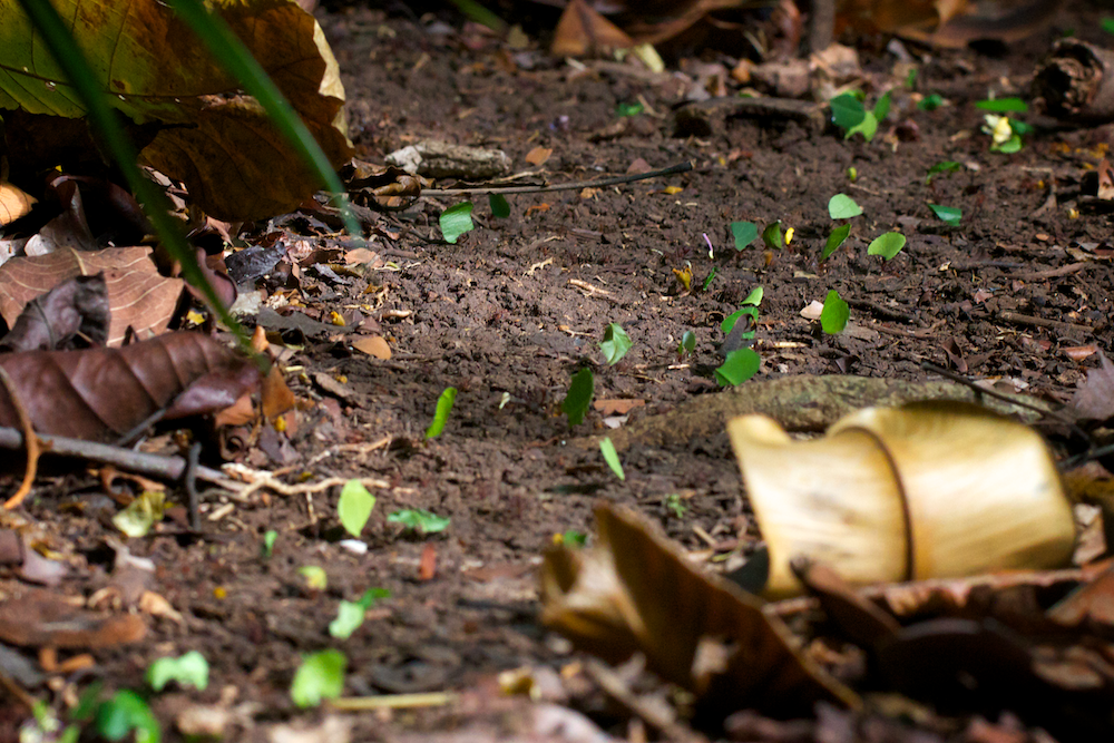 Some animals challenge the human tendency to assume our superior nature. Leafcutter ants (Atta sp.) are one of these species. These ants explore the forest, choosing only the trees with the tastiest leaves. They then send thousands of workers to systematically cut small sections from each leaf. The harvested material is carried back to their nest along trails they build in the forest – long paths devoid of all vegetation, highways for ants. Once the leaves are safely in the nest, they are fed to a certain species of fungus which is cultivated underground by the ants – and it is this fungus which serves as the ultimate food source for the leafcutter ants. Not bad for a species with a head the size of a pin!