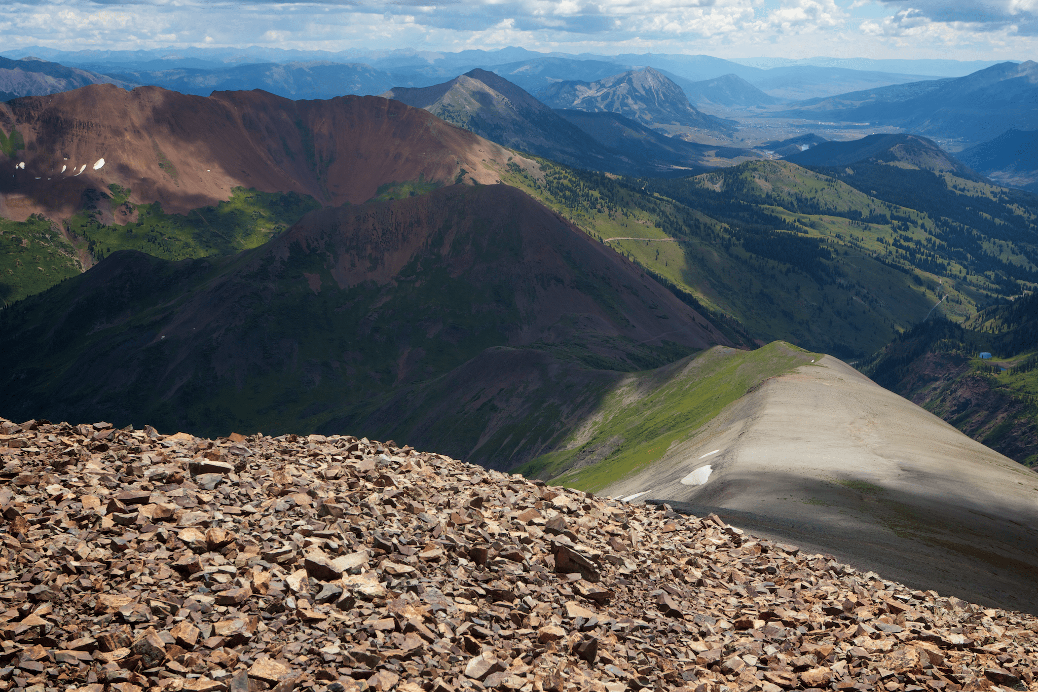 Last weekend I climbed Treasury Mountain, a massif of marine shales rising more than thirteen thousand feet above sea level. The endless slopes of loose scree are nearly bare – but not completely. Can you find the white-tailed ptarmigan (Lagopus leucura) in this photograph? The species lives on alpine tundra throughout the year, and is nearly invisible in its summer plumage.