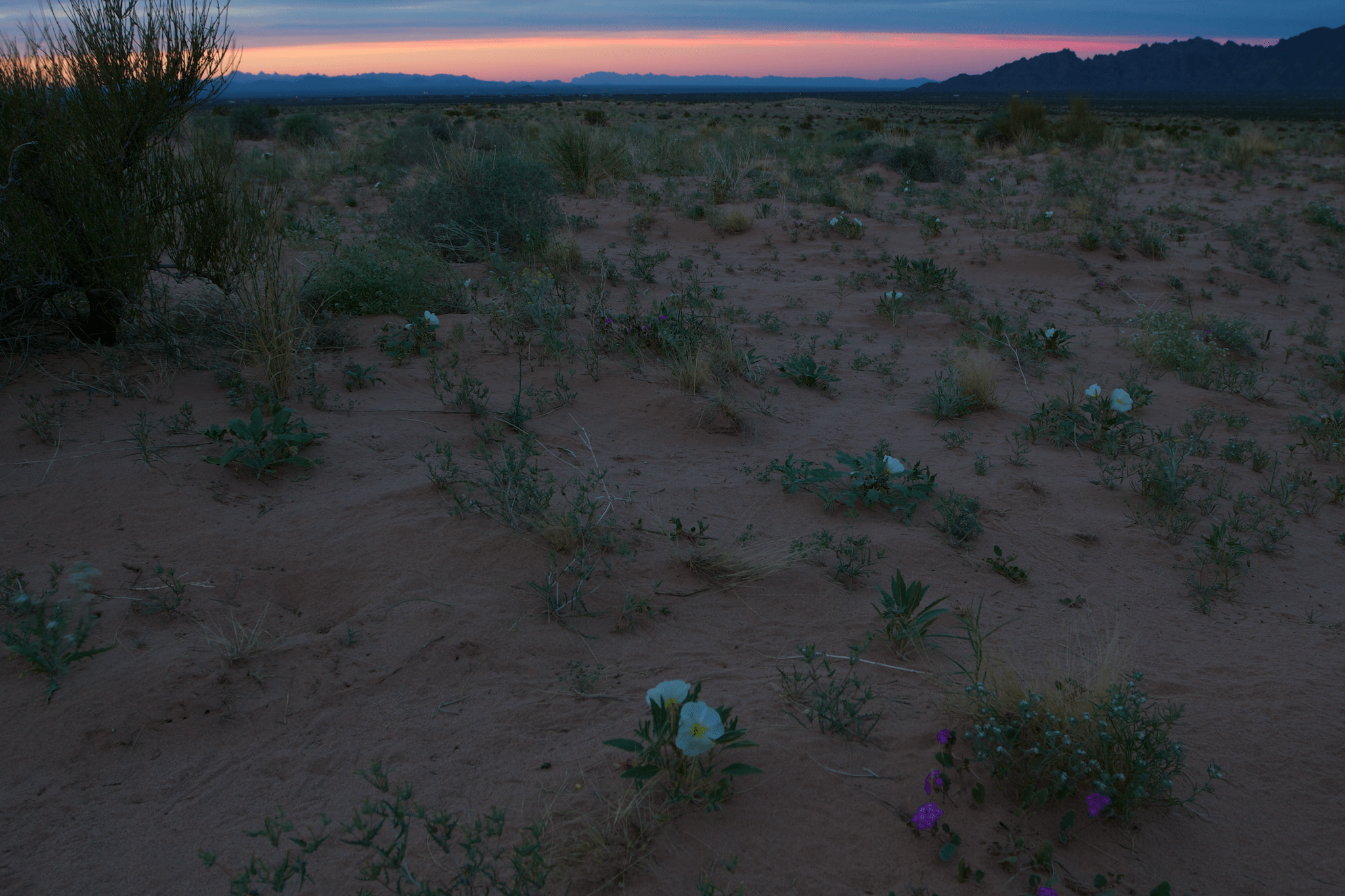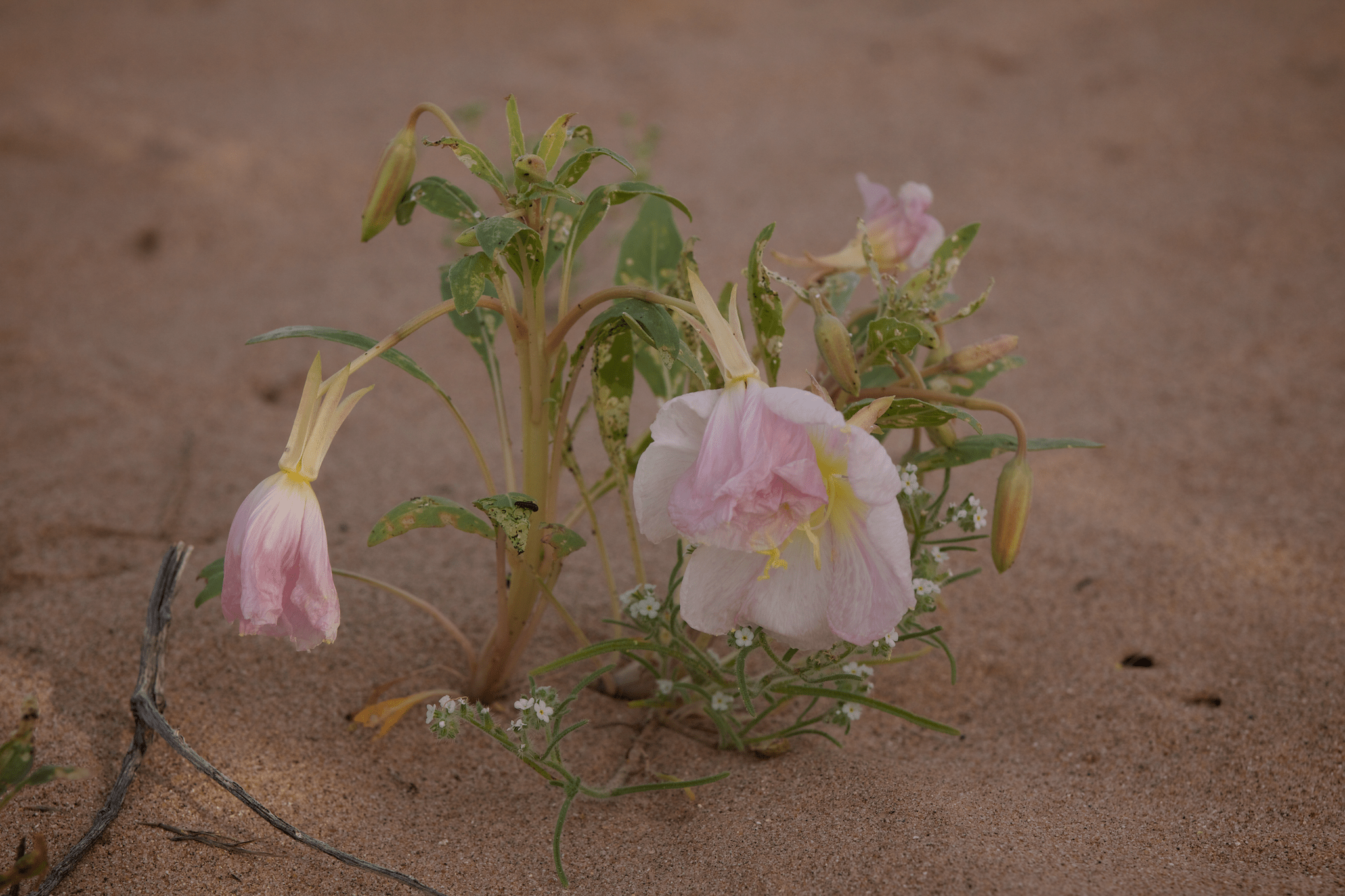 Dusk is the time when these ephemeral blooms are most spectacular. Many species have flowers that only open at night – their pollinators are not day-active, and perhaps the heat of the day would lead too too much water loss in delicate petals. My favorite species is Oenothera deltoides, a white-petaled evening-primrose.