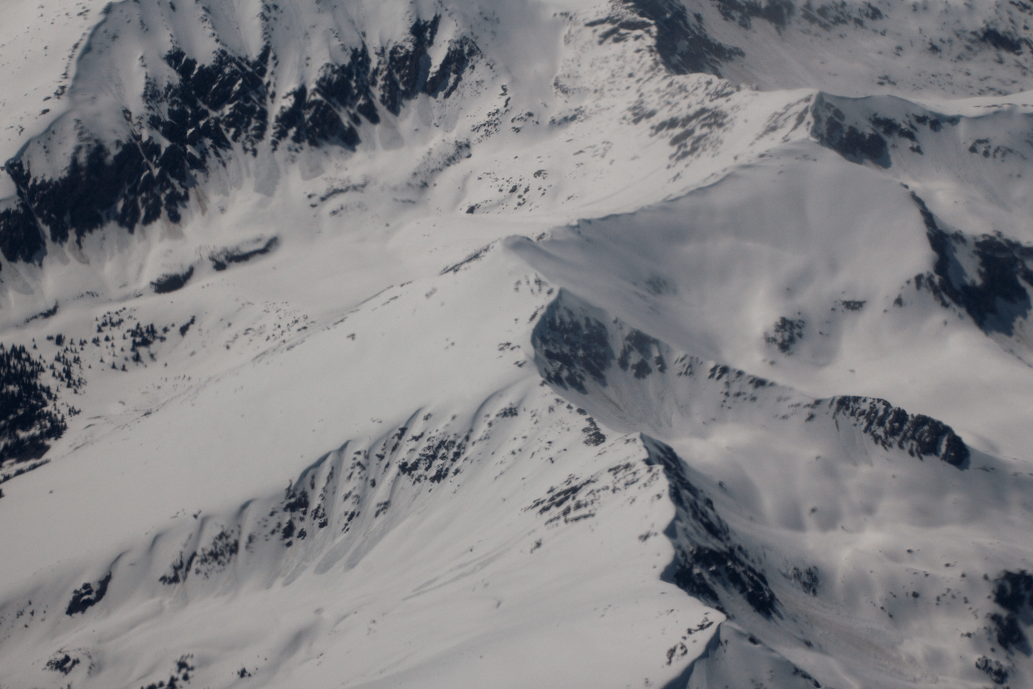Unfortunately the snow was exactly where the aerial photo showed it to be. We spent a fruitless afternoon falling waist-deep into loose snow on forested steep slopes before giving up at about 10500′. Too dangerous, and very little chance that anything would be growing.