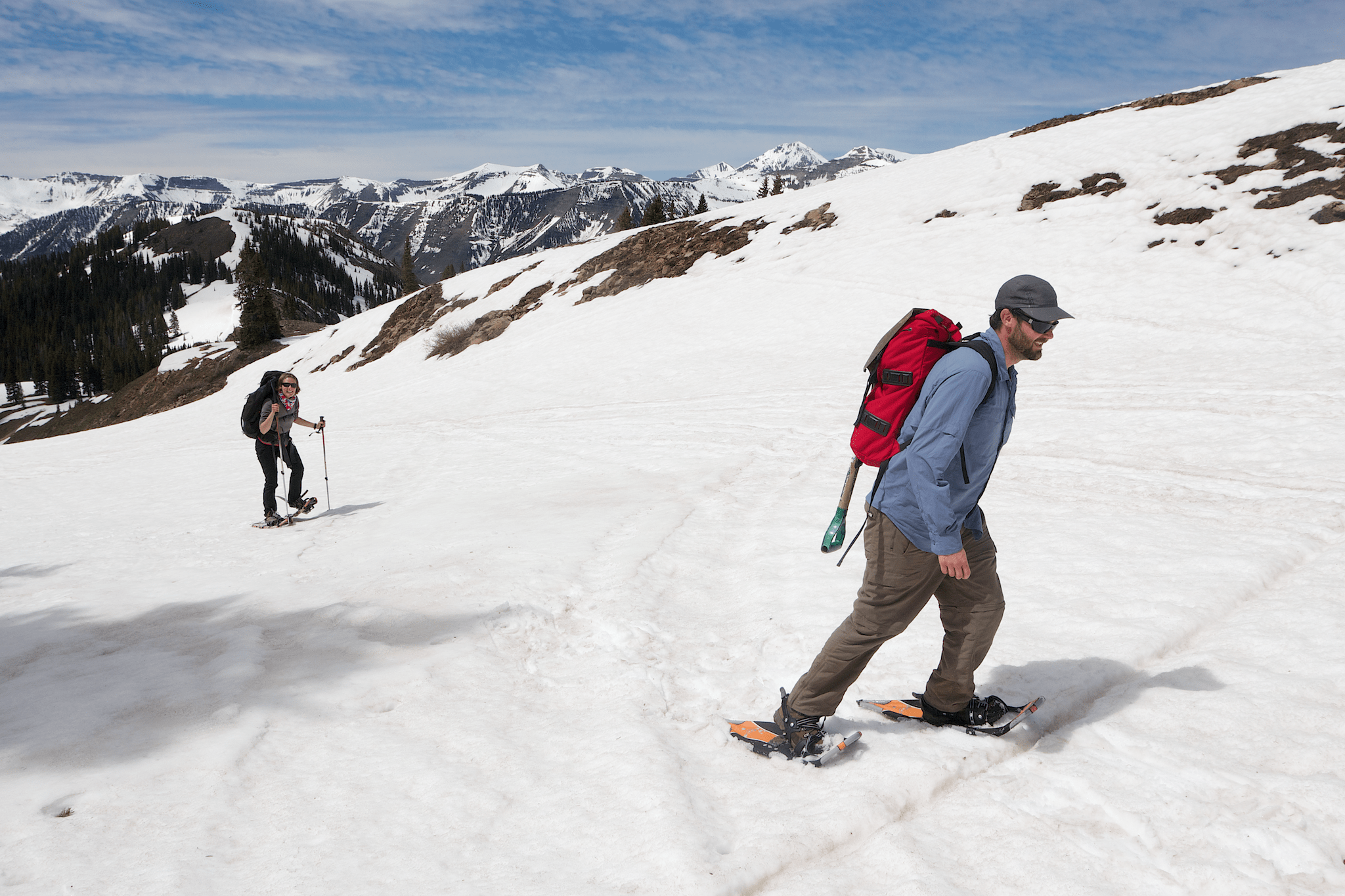 We climbed up with our gear on snowshoes, through a magical landscape of soft and packed snow, some tinted red by high-elevation algae.