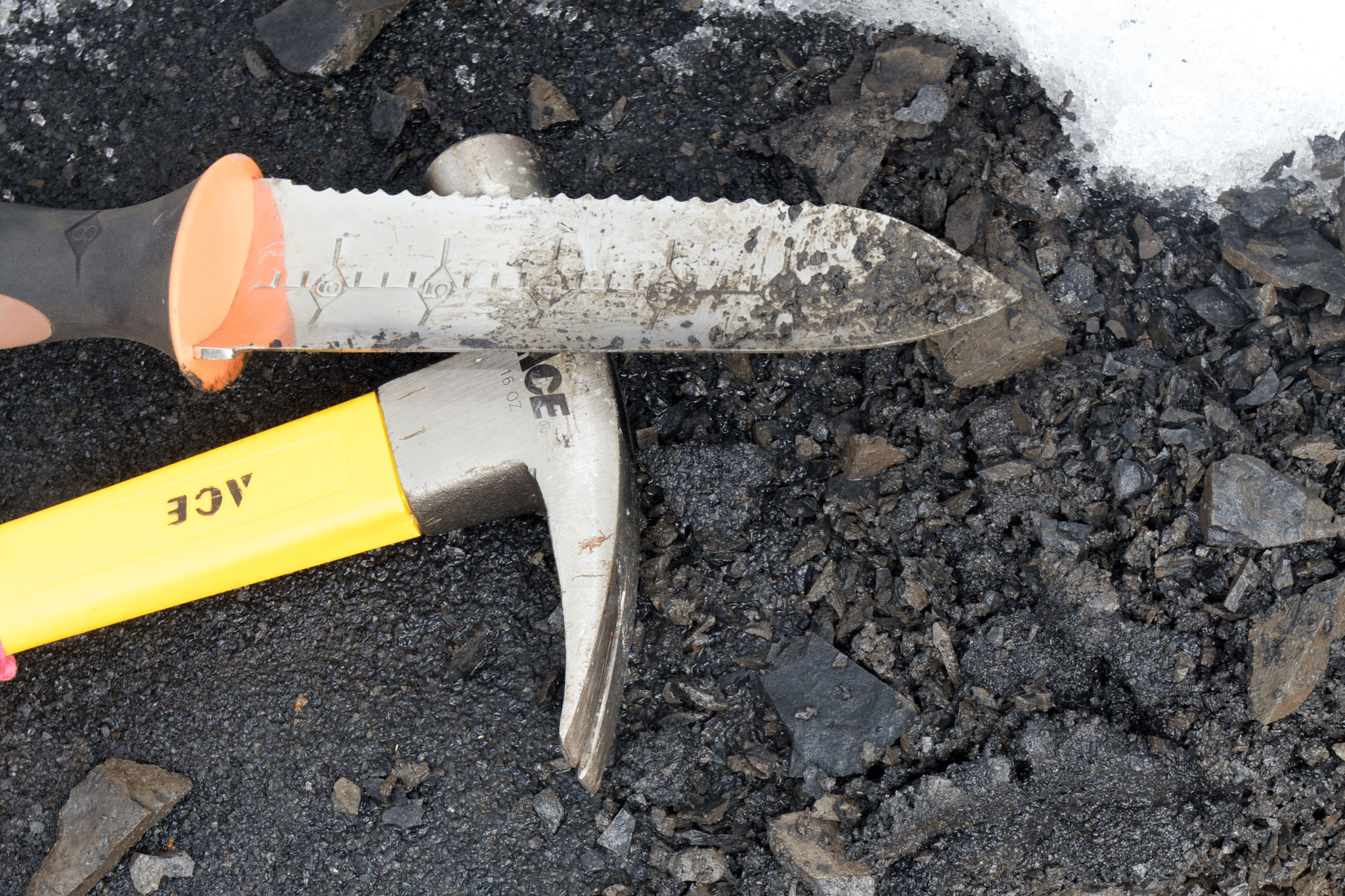 We started into the ground and quickly made it through the top layer of fresh snow, an icy layer likely from a May melt-refreeze, and then deep through many more layers. We took guesses on the snowpack depth – Sean thought waist-deep; Rozalia, navel-deep; and I, chest-deep. We were all wrong. We cut through at least eight feet of snow before finally scraping bottom and seeing the rocky substrate that constitutes the soil on this mountain. A hammer and soil knife served to break through the soil to make space for buried instruments.