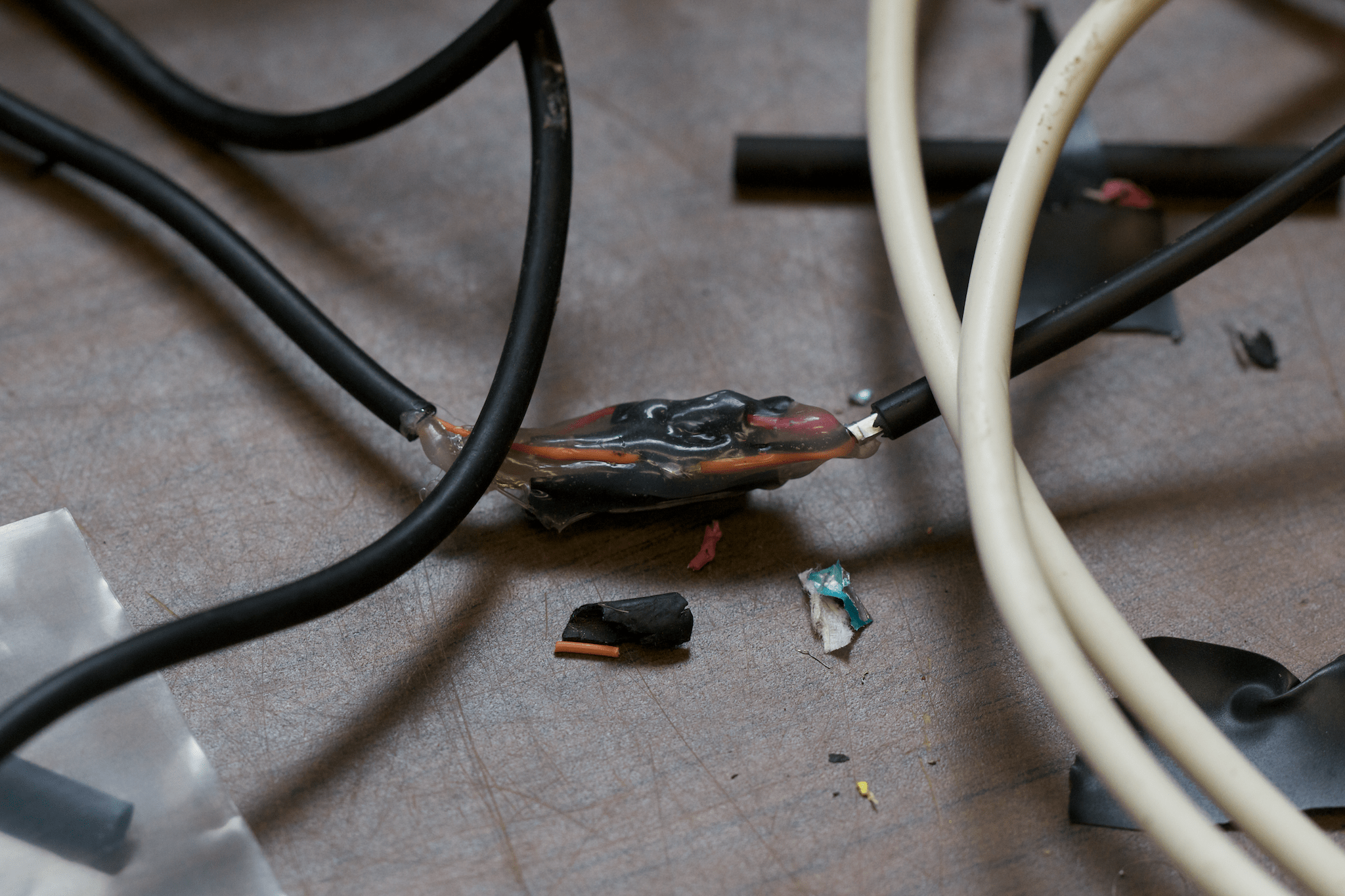 Back in the lab, I found five or six places where the cables for various instruments had been nibbled, and three where it was chewed clear through. I cut away the problematic sections, stripped each cable and then all of its data lines, re-soldered the connections, heat-shrinked the joint, then waterproofed the repair job and patched the external wrapping.