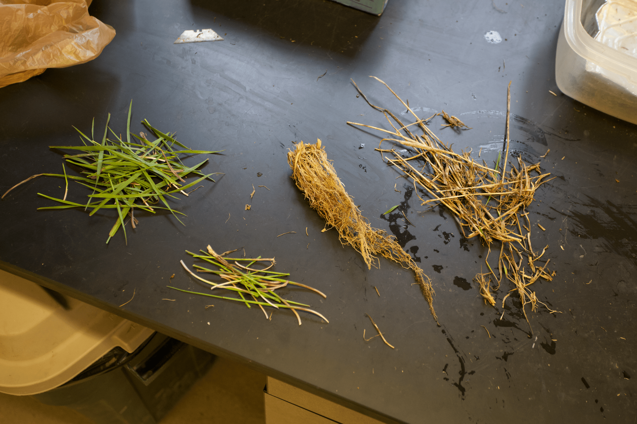 And it also turns out that not every species has this same extensive root system. Here is a grass species I brought back to the lab, Achnatherum lettermanii. In this case I dissected it into leaves, stems, roots, and dead tissue. You can see here that the roots are much shorter and smaller – a marked contrast to the buckwheat.