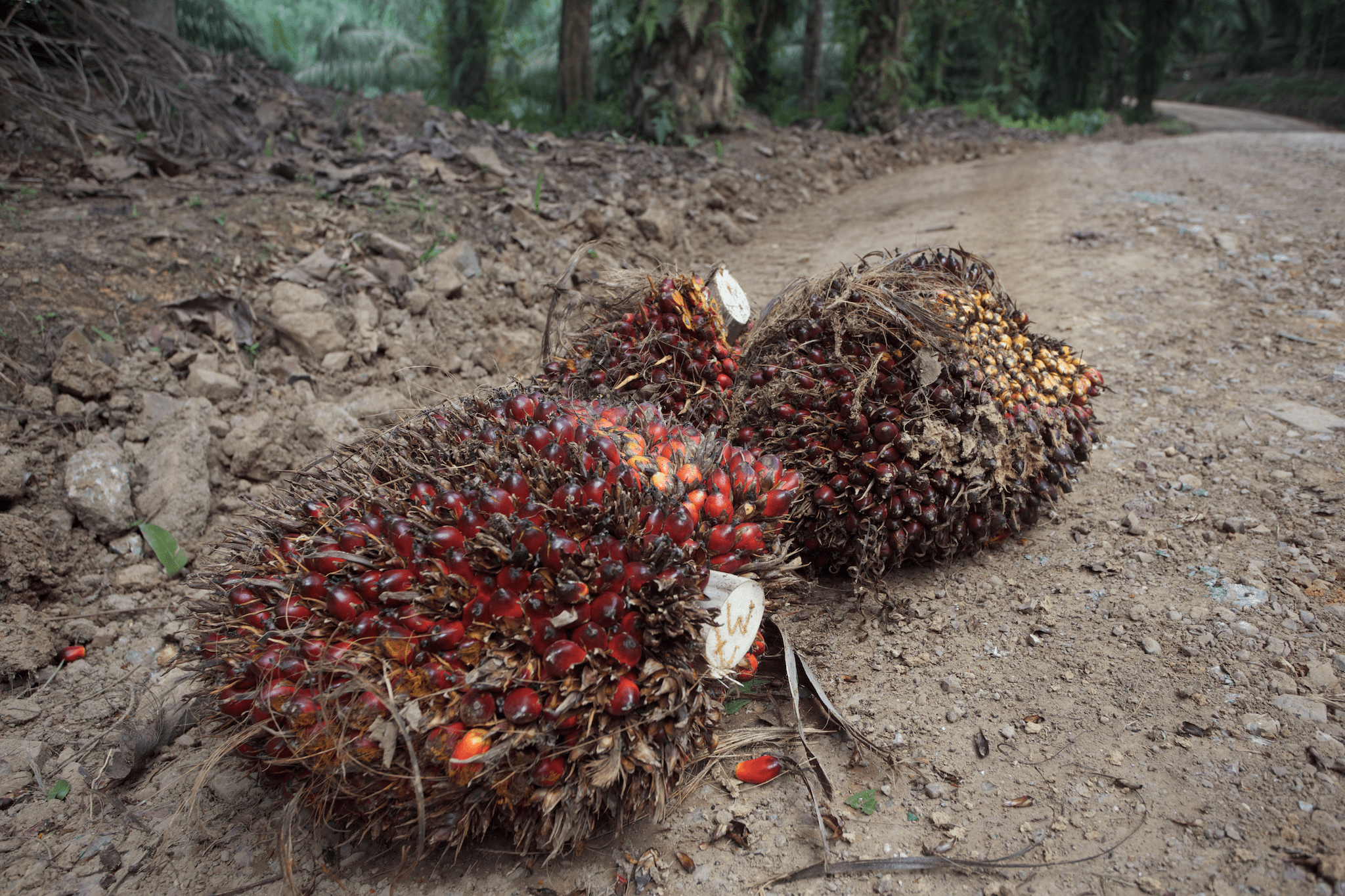 The reason for all this effort is the large and heavy bunches of bright-red fruits the tree often produces. These are cut down by hand, then trucked out of the plantation.