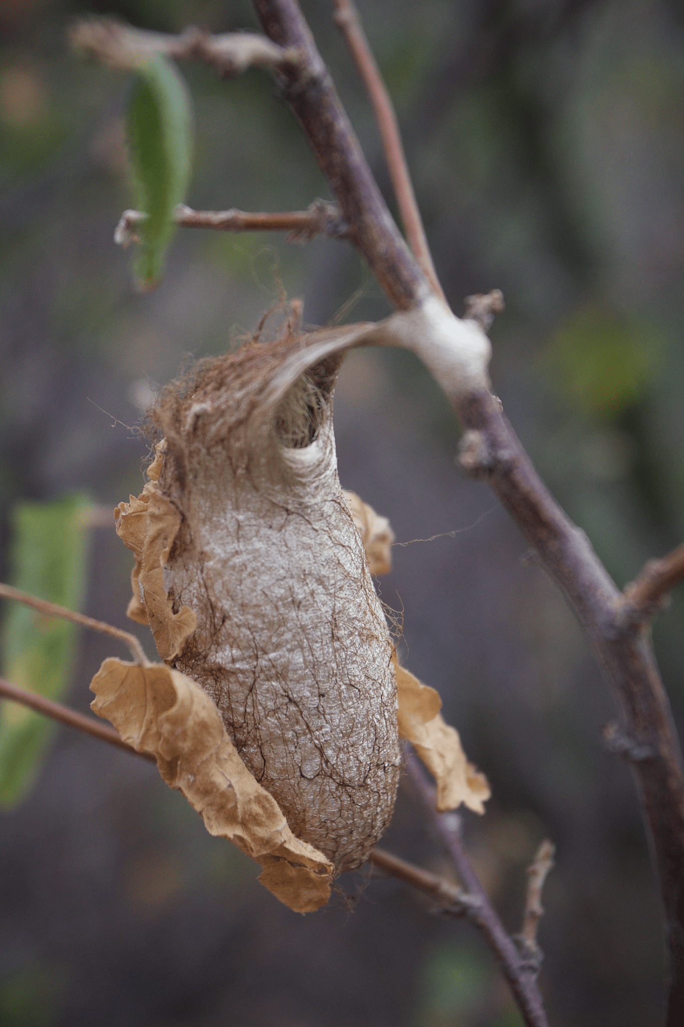 And my best discovery, hanging low on the branch of a Jatropha (Euphorbiaceae) shrub – an enormous cocoon of the saturniid moth, Rothschildia cincta. I had seen these used before as ankle rattles in ceremonial dances by the Yaqui people, but never knew where they were from. They are marvelously light, smooth, and strong. I only found two in three days of looking.