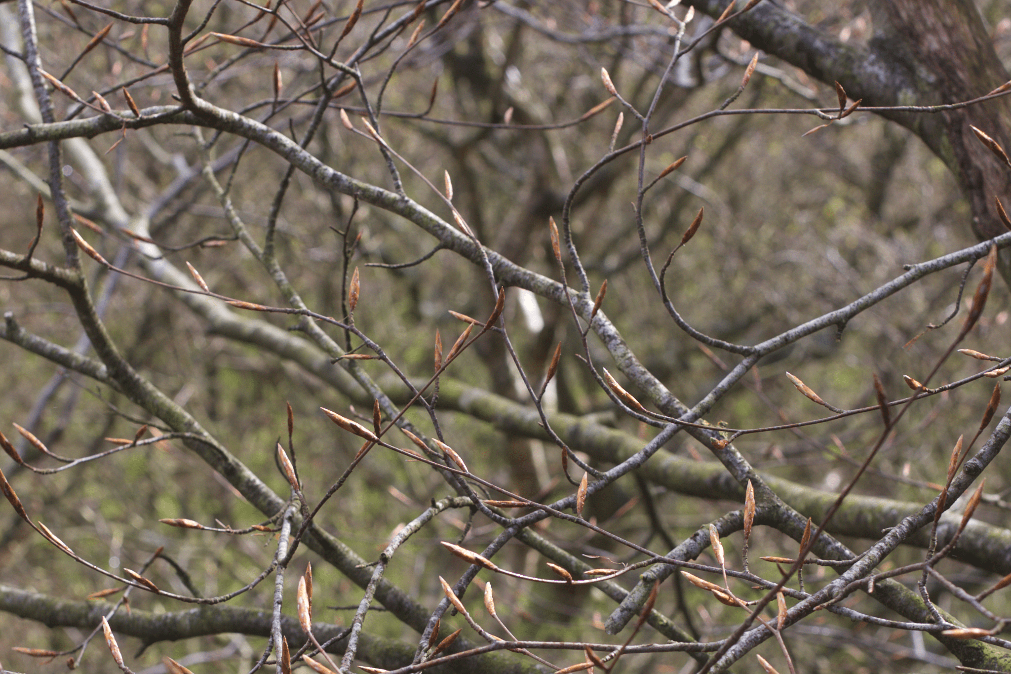 This beech tree (Fagus sylvatica (Fagaceae)) has elongated its buds, but has no leaves deployed yet.